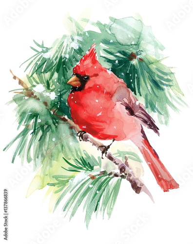 Watercolor Bird Cardinal Winter Christmas Hand Painted Greeting Card Illustration - Buy this stock illustration and explore similar illustrations at Adobe Stock | Adobe Stock