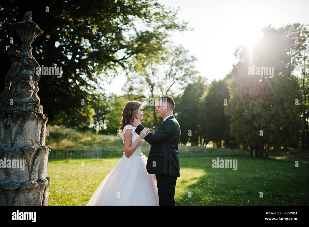 Cute Newly Married Couple Posing Next To An Old Fountain On Their Stock Photo Alamy